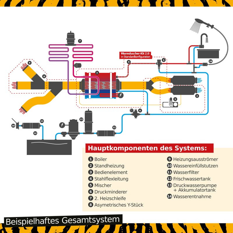 Das Warmduscher-Kit 2.0 besteht aus zwei Hauptkomponenten (Heizung und Boiler) und Material, um diese zu verbinden und so zu installieren, damit ein perfekt zusammen funktionierendes System entsteht.