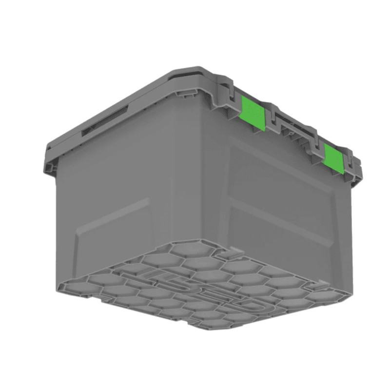 Die Box enthält Aufnahmen zur Befestigung mit Zurrgurten für sicheren, rutschfesten Transport. Der Deckel kann abgenommen werden, ohne die Zurrgurte zu lösen.